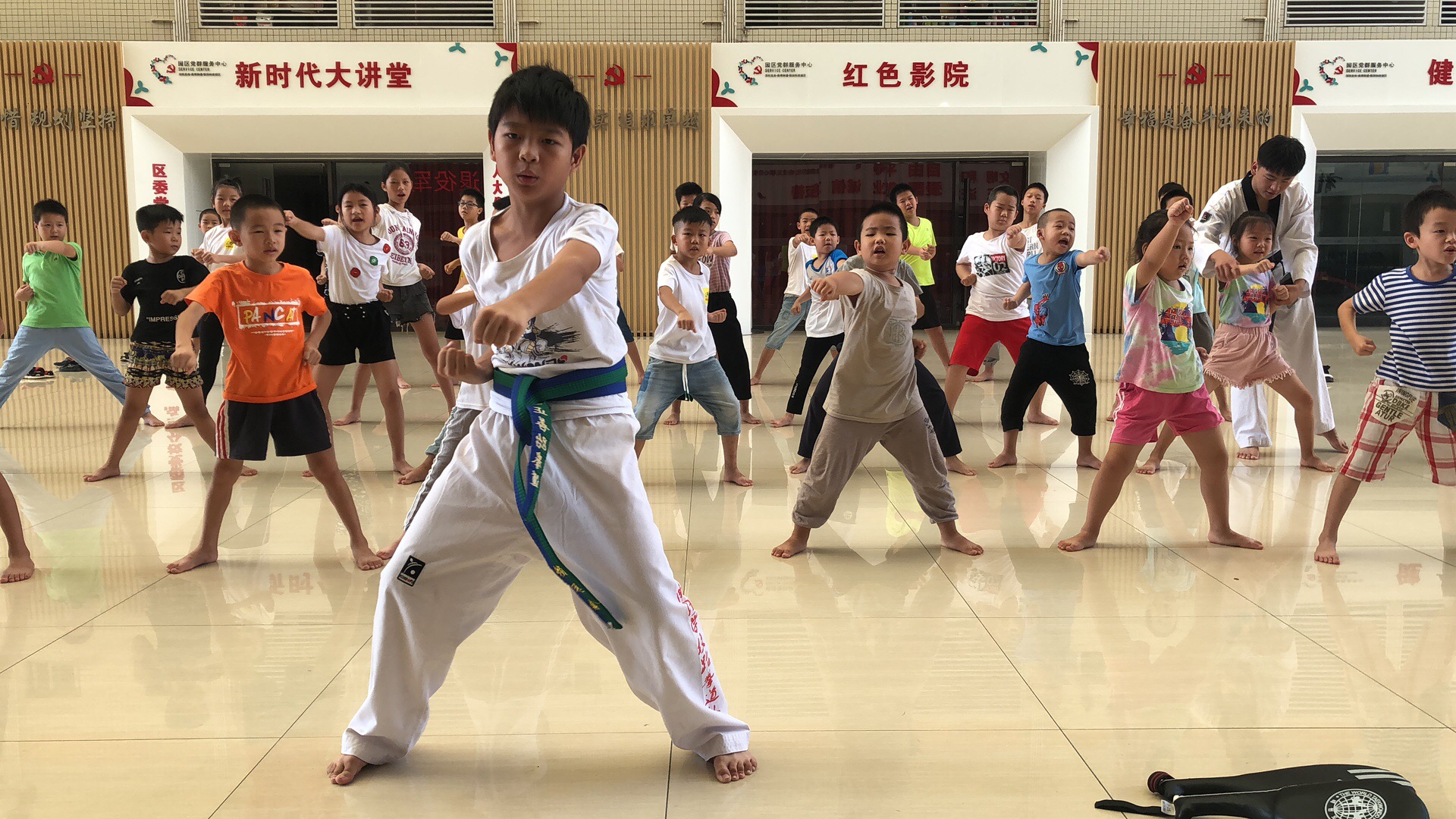 首先是拳的部分,沖拳。老師:出拳!孩子們:哈!一聲比一聲更鏗鏘有力,堅定著每一拳的出擊。